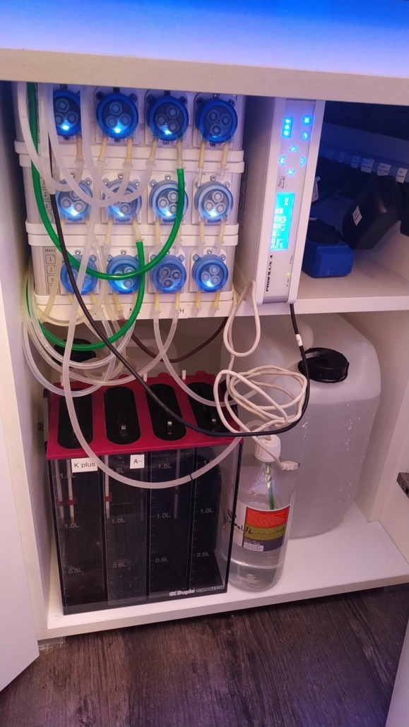 Strömung: 2 x Tunze Stream 6105, 2x Tunze Stream 6095 (alle verbunden mit GHL Profilux 4 Computer)